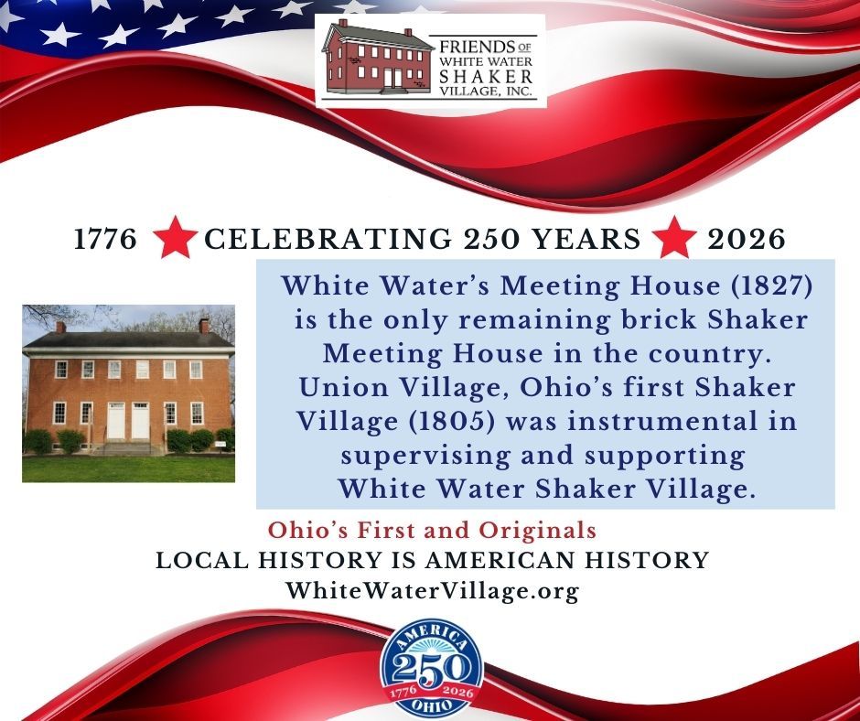 White Water's Meeting House is the only brick Shaker meeting house built in Ohio and the only one of the two brick Shaker meeting houses built in America remaining. The other brick meeting house was at South Union Shaker Village in Auburn, Kentucky.