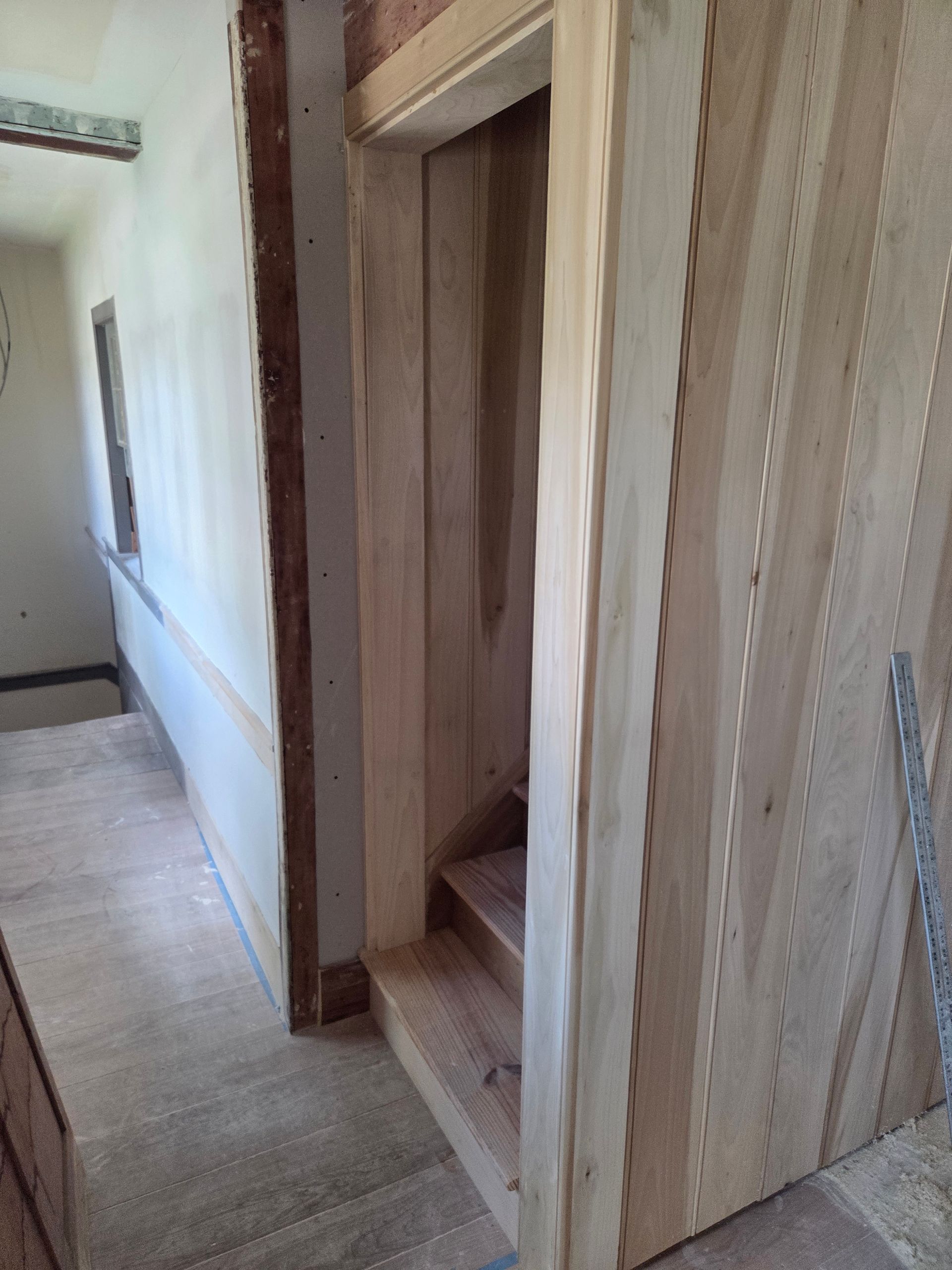The attic stairs are almost complete. The first floor ceiling and beam caps are up and ready to paint.